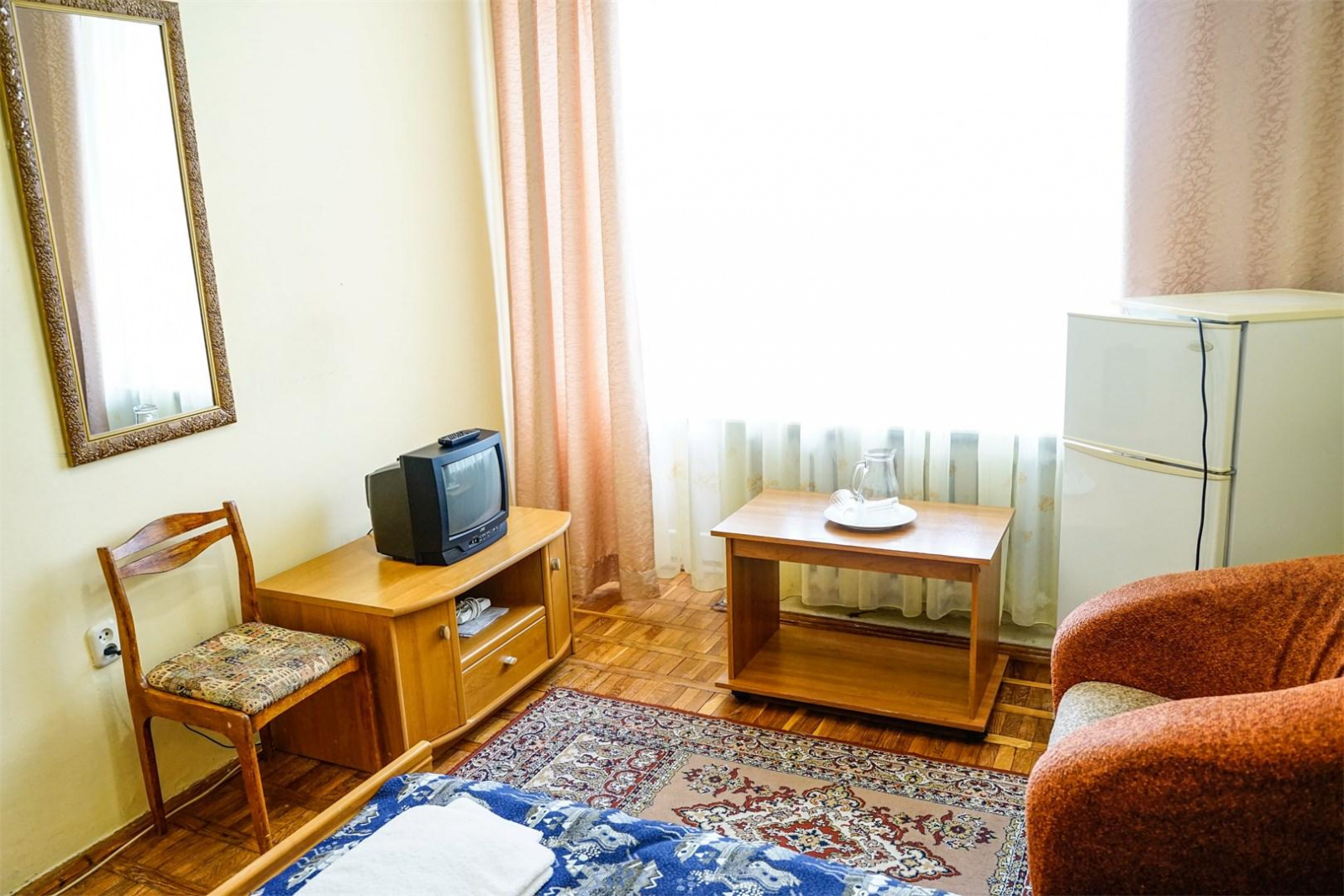 Номер бюджетной категории с оптимальным набором удобств и двумя односпальными кроватями. В номере есть телевизор, холодильник, совмещенный сан.узел, душевая кабина, пластиковые окна, шкаф для хранения ваших вещей.