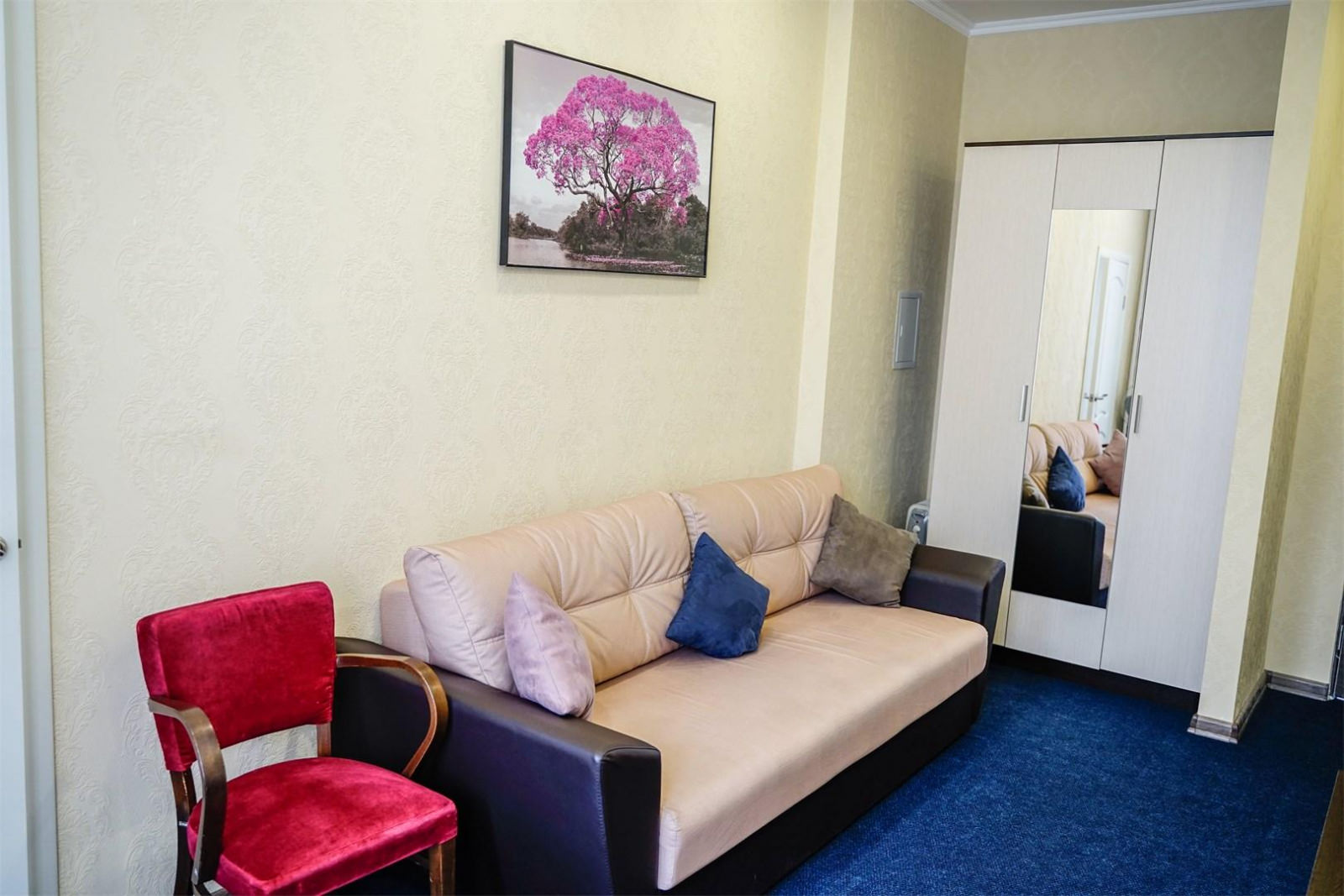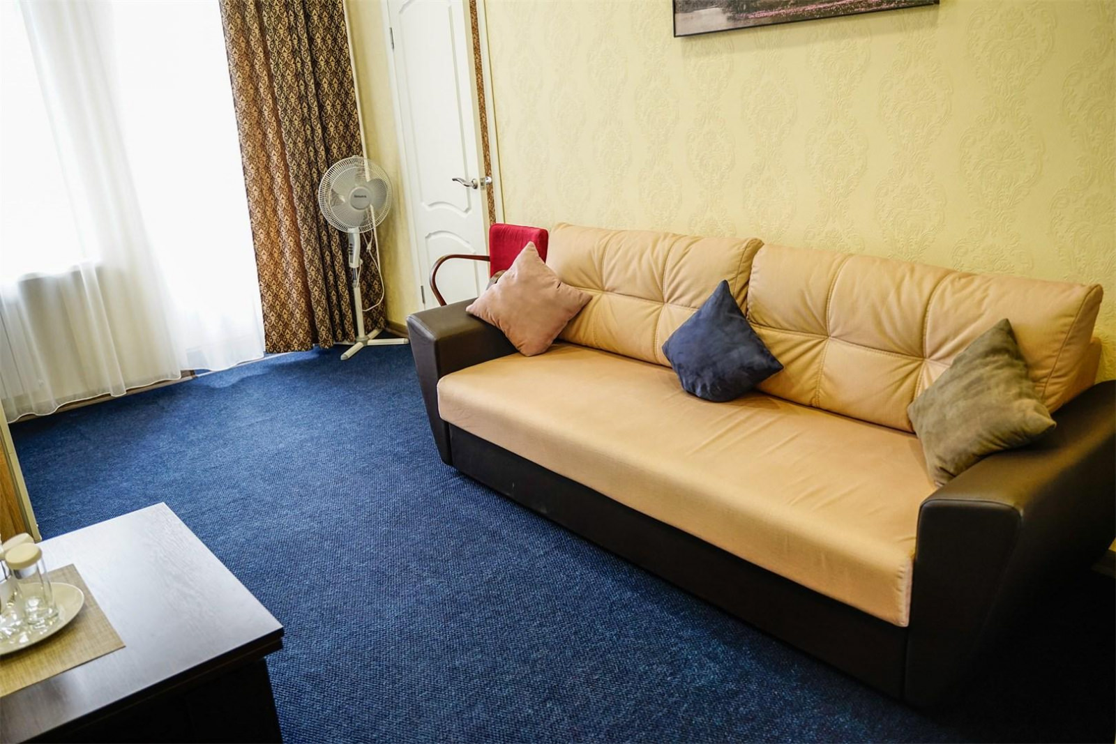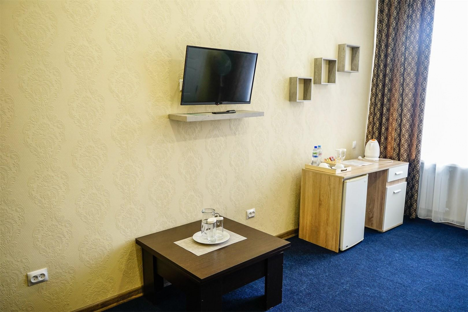 Номер категории люкс с оптимальным набором удобств, одной двухспальной кроватью и раскладным диваном. В номере есть телевизор, холодильник, совмещенный сан. узел, душевая кабина, шкаф для хранения ваших вещей, комод, пластиковые окна, электрический чайник.